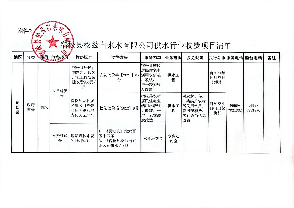 宿松縣松茲自來水有限公司供水收費(fèi)項(xiàng)目清單