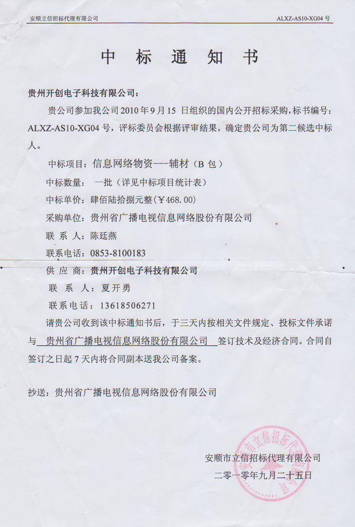 我公司中標省廣電網絡公司輔材采購